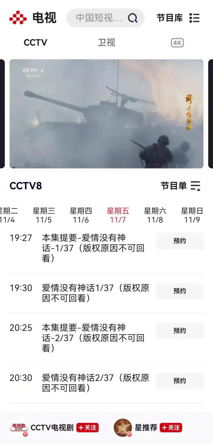 此前,CCTV8的节目单显示:11月7日晚7点半的电视剧为《爱情没有神话》。图据澎湃新闻