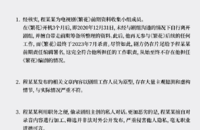 2025年9月23日晚,《繁花》剧组就近期剧本创作相关争议发布正式声明。声明中指出,经核实,程某某(笔名“古二…